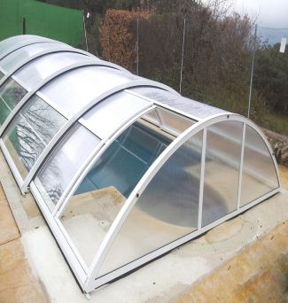 que ofrece al usuario la posibilidad de abrir o cerrar su cubierta en pocos minutos gracias a su sistema de plegado telescópico. Su altura inicial aproximada es de unos 90cm en su primer modulo, es una cubierta que no consta de raíles o guías en suelo dejando todo el perímetro de la piscina sin ningún obstáculo o escalón fabricada a medida.